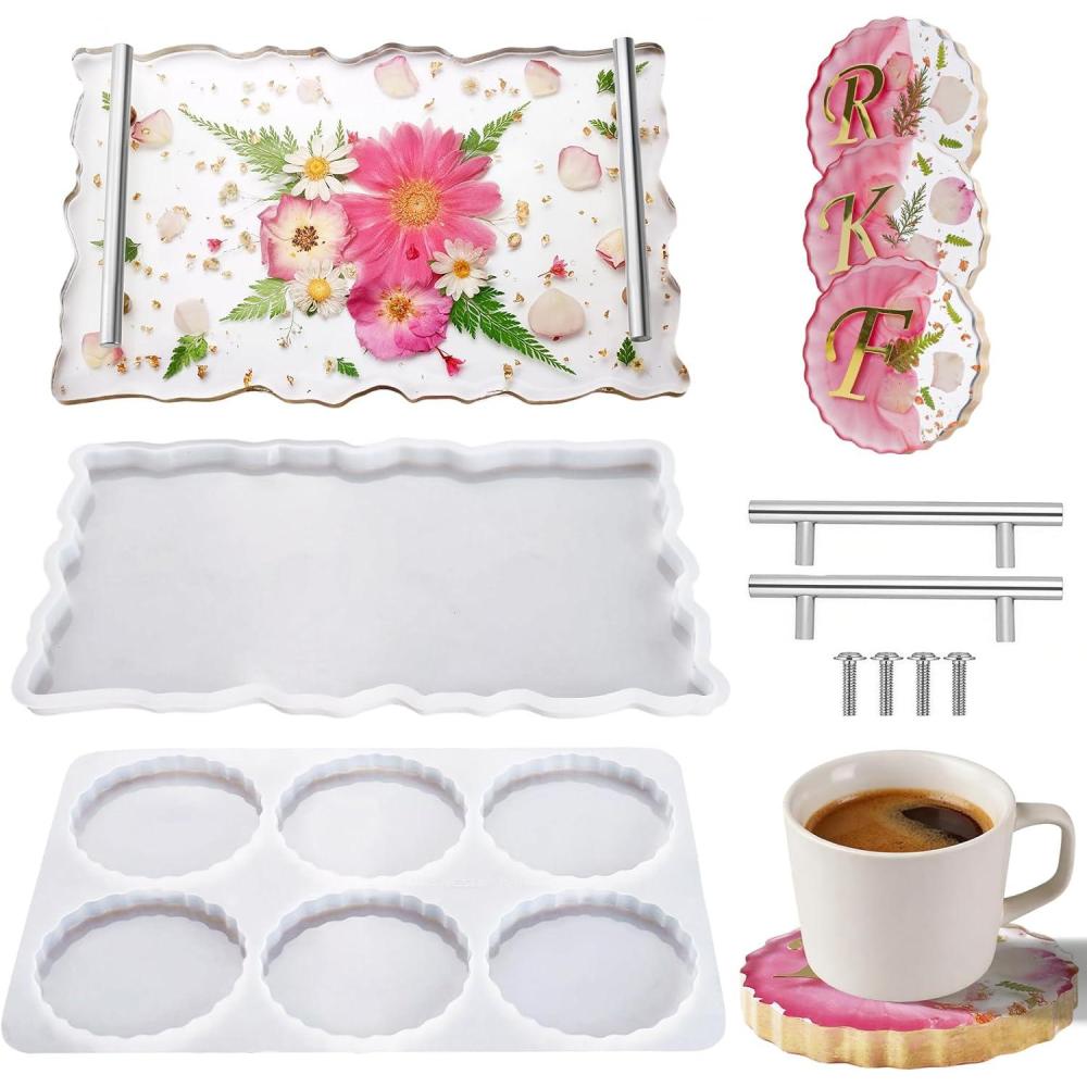 LET’S RESIN 6 Cavity Resin Coaster Molds and Tray Molds with Handle, Epoxy Resin Coaster Molds for Cups Mats, Coaster Silicone Molds for Flower Bouquet Preservation, DIY Art Craft and Home Decoration(tray and coaster molds)