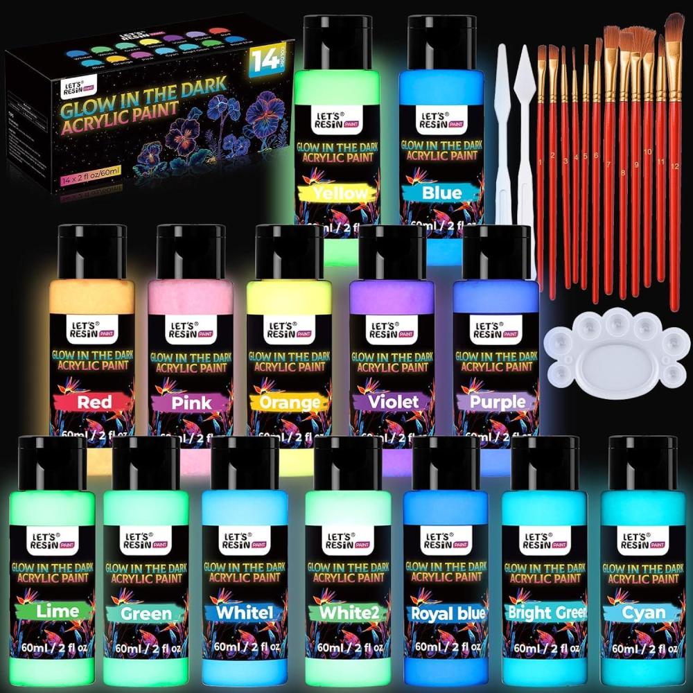 LET’S RESIN Glow in the Dark Acrylic Paint,14 Bright Colors Each 60ml/2oz Blacklight Paint Set,Neon Paint with Brushes,Knives,Palette, UV Fluorescent Craft Paint for Painting,Easter,Halloween Party Decor