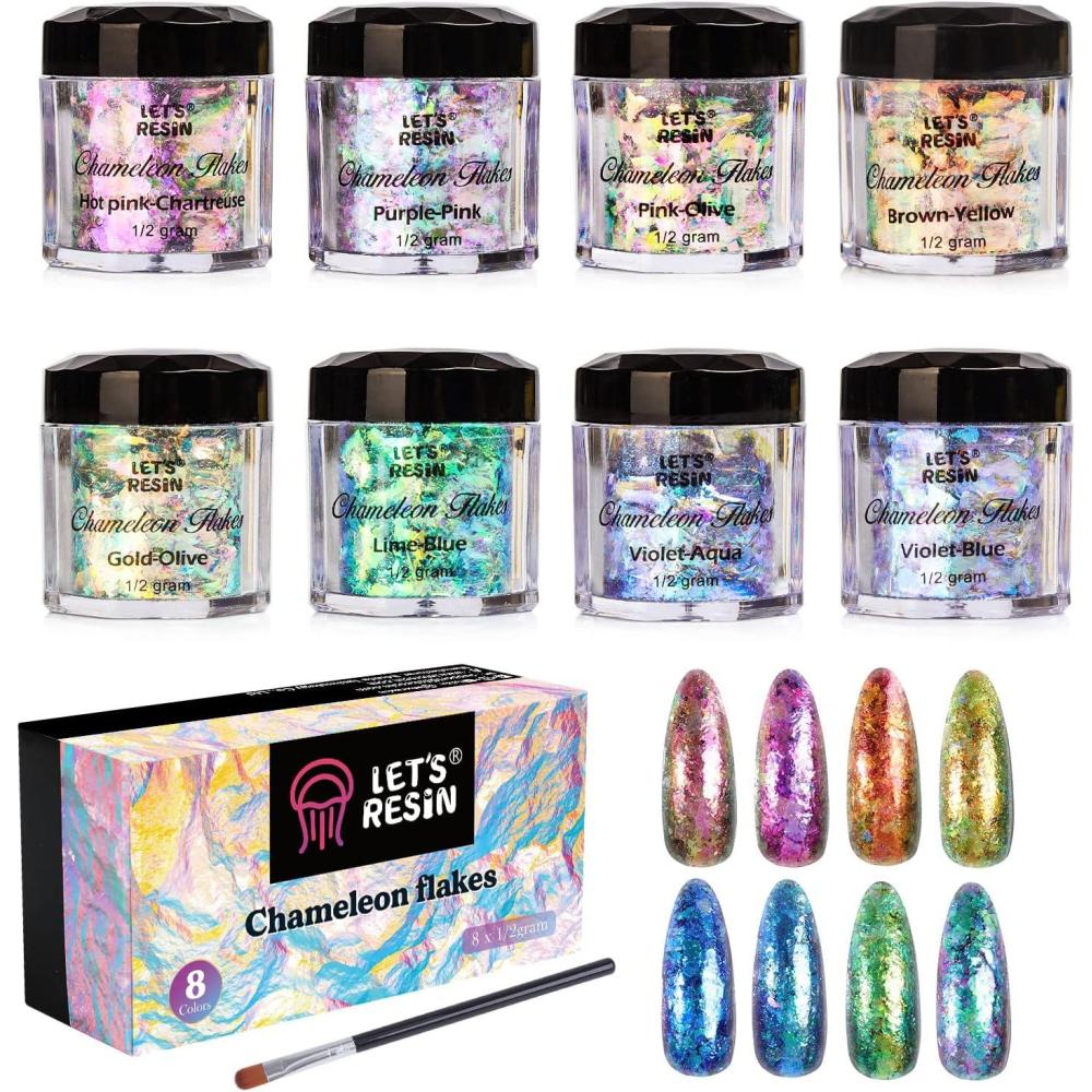 LET’S RESIN Chameleon Chunky Flakes, Resin Supplies-8 Color Intense Colorshift Pigment Powder for Resin Crafts/Tumblers, Chrome Powder Iridescent Flakes for Nail Art/Paints/Soap Making