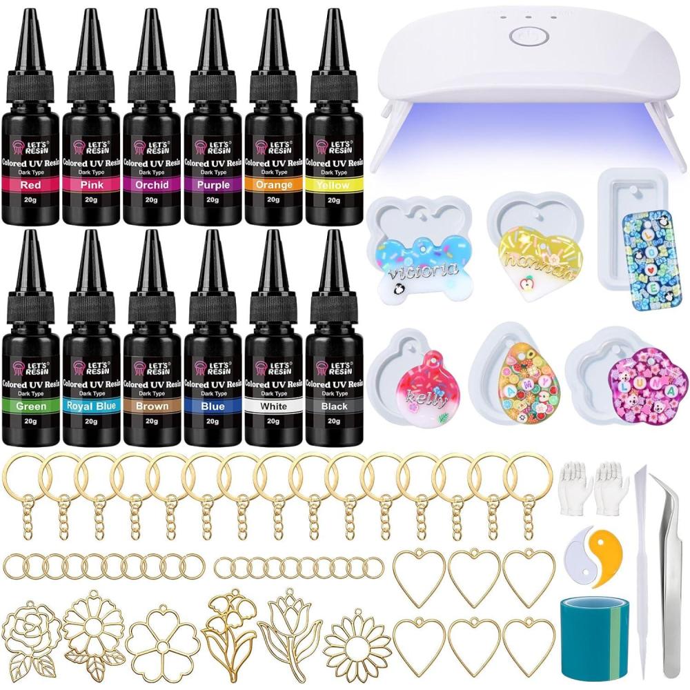 LET’S RESIN All-Inclusive Keychain Making Kit, 12-Color UV Resin with Keychain Molds Silicone, UV Light, 6 Styles Flower and Heart Open Bezels for Resin, Jewelry Making Kit for Beginners, Craft Decor(240g Colored Keychain Making Kit)
