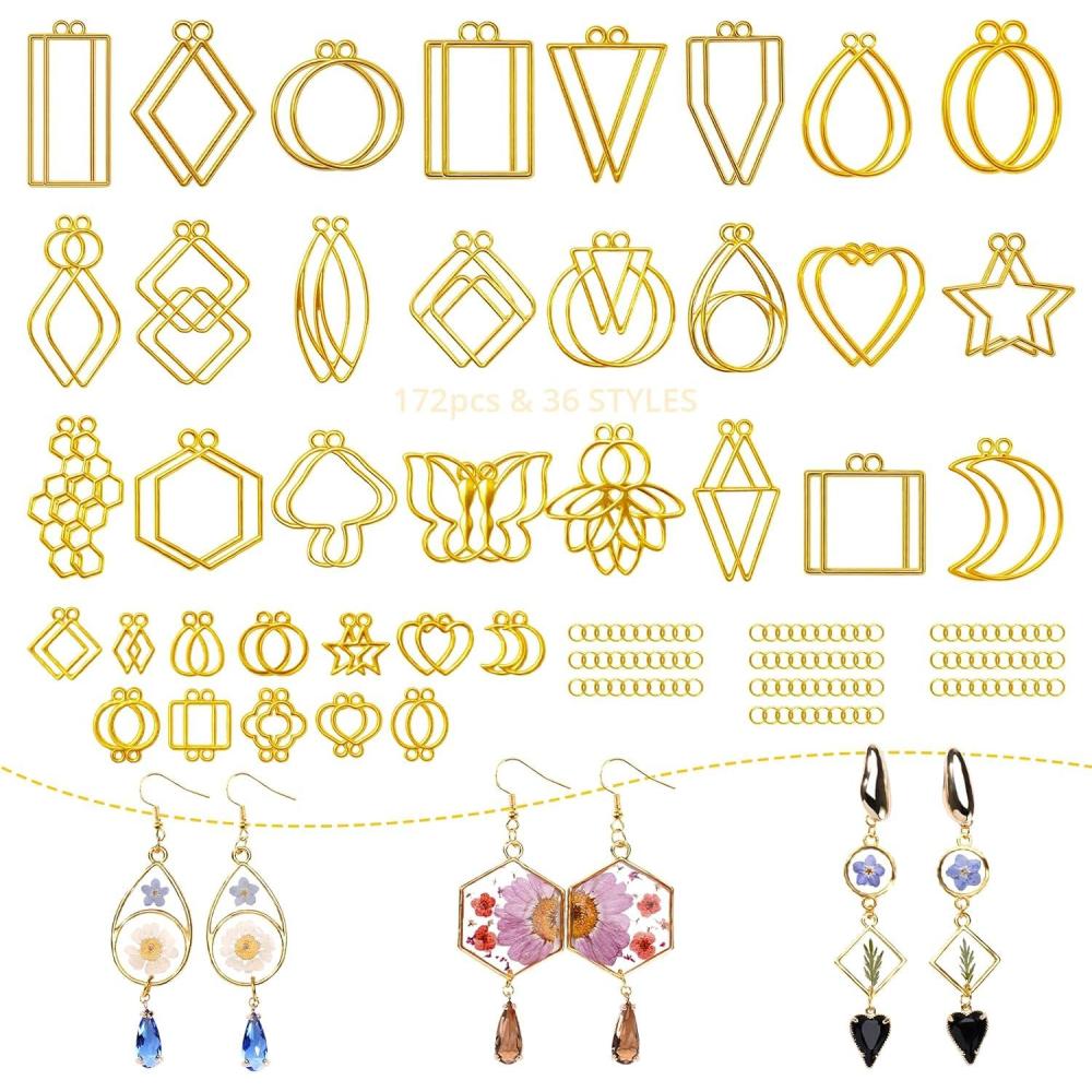 LET’S RESIN 172 pcs Open Bezels for Resin, 2 Size 36 Styles of Gold Hollow Frame Pendants Bezels with 100pcs Jump Rings, Unique Resin Bezels for Jewelry Making, Necklaces Earrings Making Supplies
